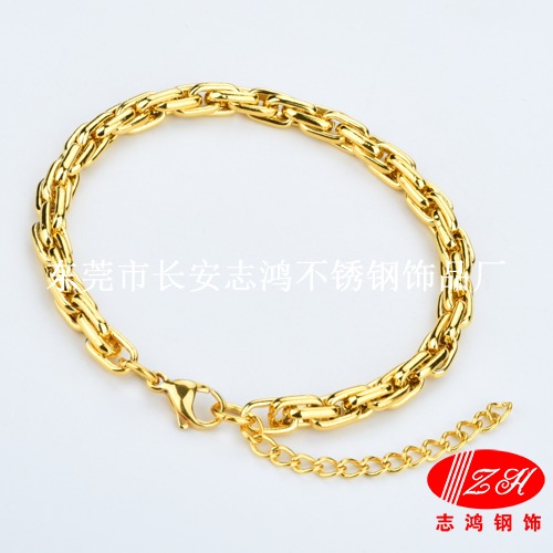 产品描述: 品名:手工麻花手链 材质:304。手链直径:6mm、9mm、10mm,手链长度:19cm+5cm延长链,手链长度可以按照客户要求裁剪定做。链子表面:电解抛光处理;颜色有:钢色(银白色)、可以真空电镀(金色、玫瑰金、黑色)等颜色。